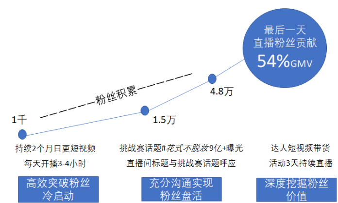 之后,發(fā)起#花式不脫妝#超級挑戰(zhàn)賽,期間直播間標(biāo)題與挑戰(zhàn)賽話題呼應(yīng),迅速帶來3倍粉絲增長。