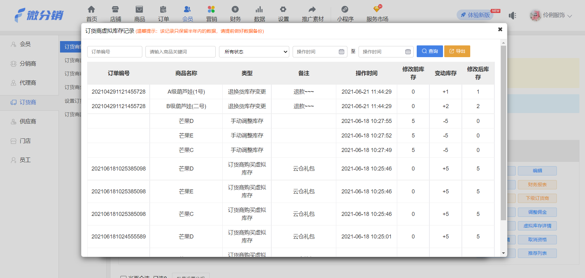 現邏輯:訂貨商虛擬庫存記錄中增加提醒:虛擬庫存記錄半年清除;