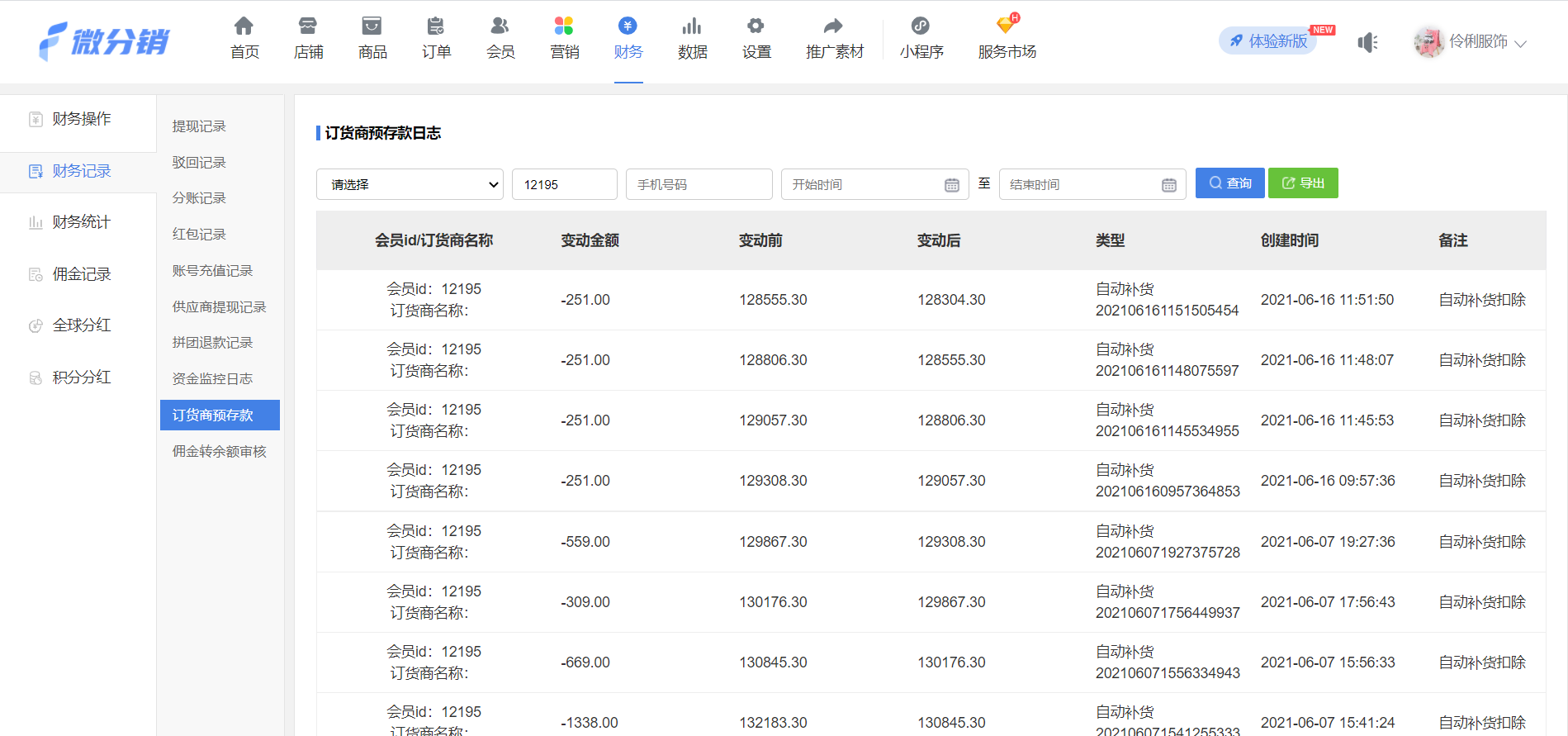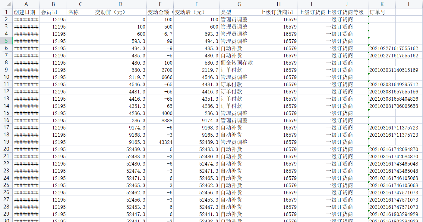 邏輯:財務-財務記錄-訂貨商預存款,導出表格增加“變動前”和“變動后”的字段和對應的數據;