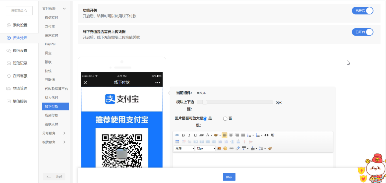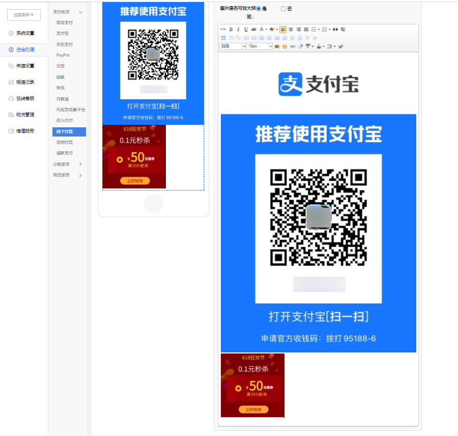 現邏輯:設置-資金處理-線下付款,上傳圖片后,手機端下單選擇線下付款時,能夠根據手機自適應;