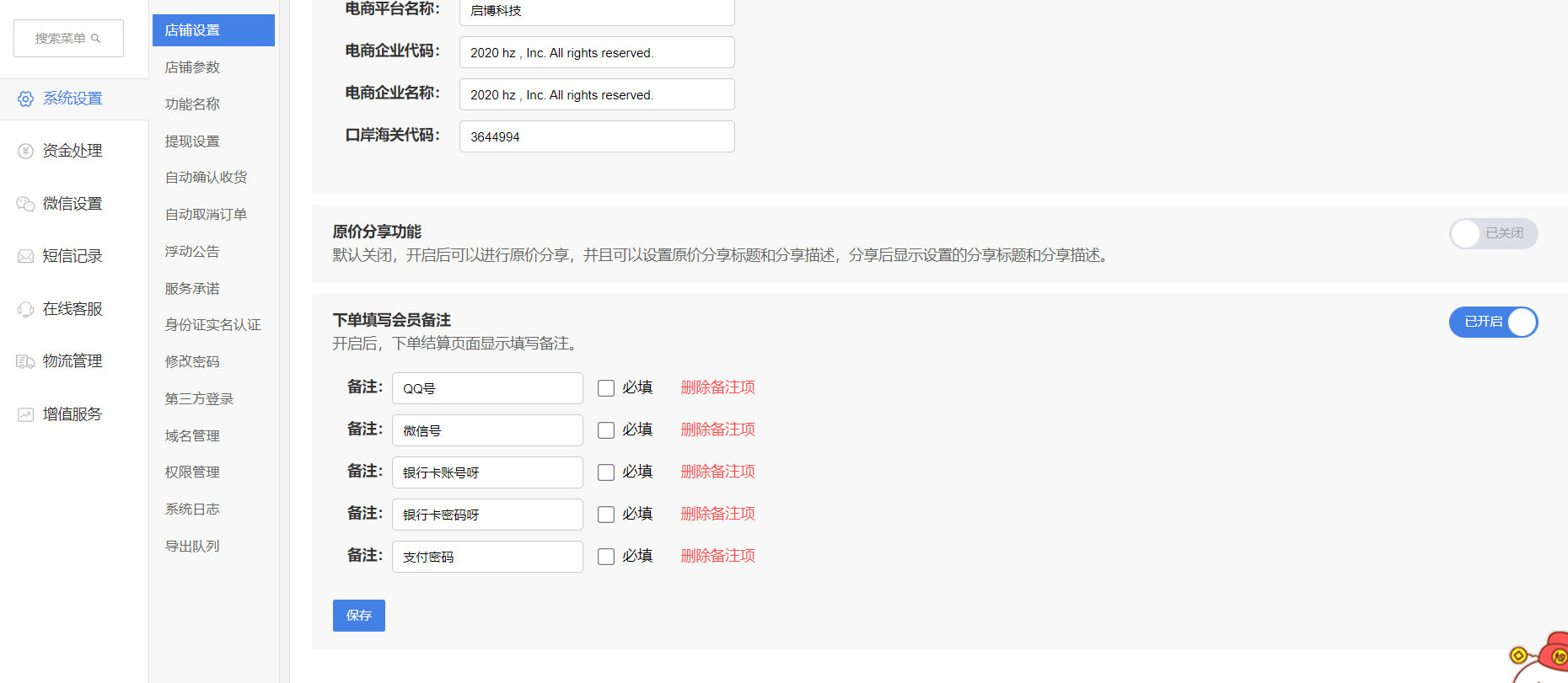 現邏輯:系統設置-店鋪信息-購物設置-下單填寫會員備注資料;買家下單時,提示需要填寫信息才可下單;