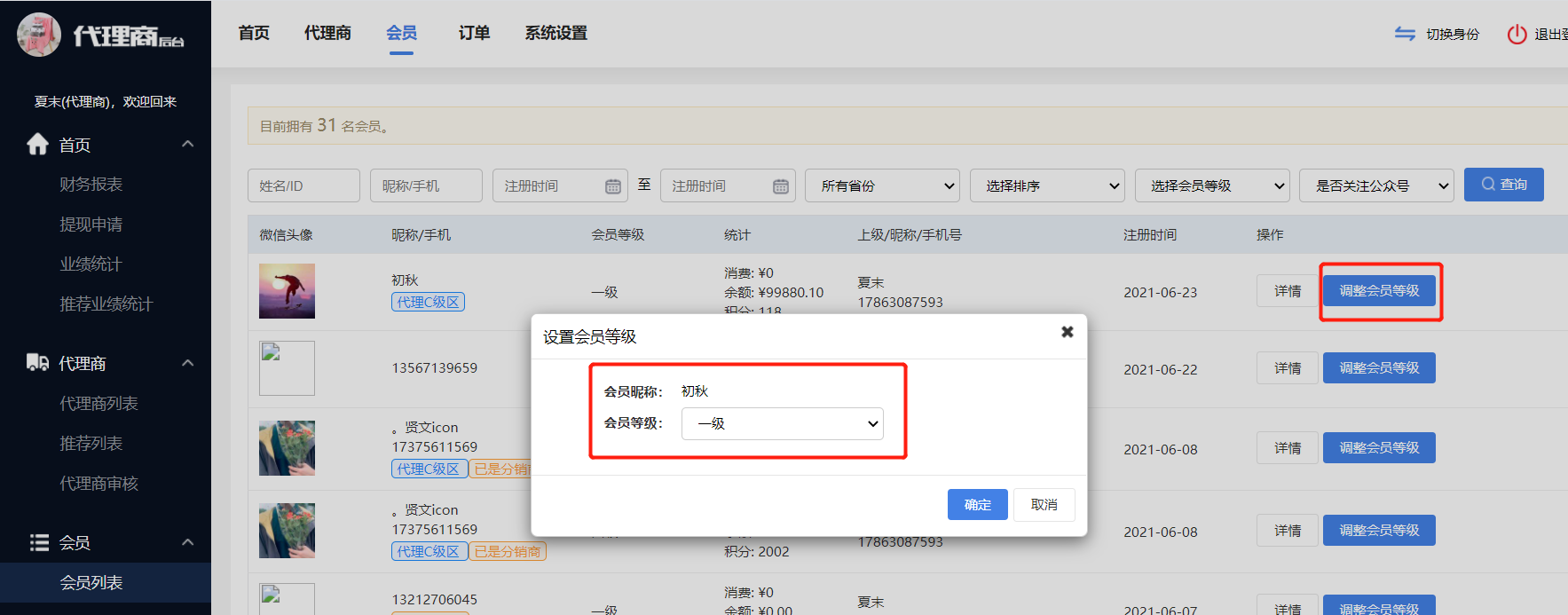 現邏輯:新增對會員等級的調整功能,新增對會員分銷商資質的管理;