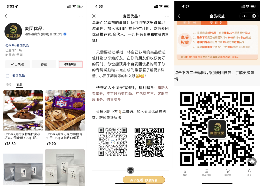 麥團(tuán)優(yōu)品基于微信域內(nèi)全鏈路打通,把私域運營聚焦到“視頻號+企業(yè)微信+小程序+社群”的組合上。