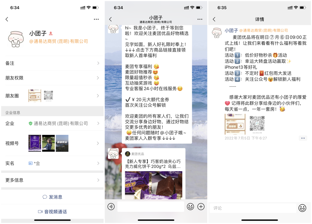 麥團(tuán)優(yōu)品根據(jù)各平臺特性,在微信公眾號、視頻號、商城小程序等多個線上渠道,設(shè)置導(dǎo)流“鉤子”即“新人專享福利”,吸引用戶添加企業(yè)微信號。