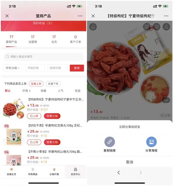 只有通過分銷員專屬二維碼或分享早康枸杞商城產(chǎn)品鏈接成功關(guān)注的好友即可自動成為下級客戶,他們每買一件產(chǎn)品分銷員將直接獲得相應(yīng)的傭金獎勵。