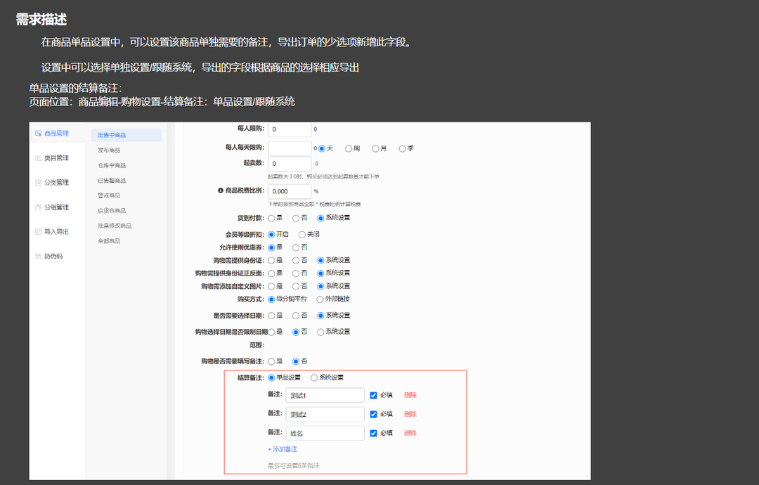 需求描述:在商品單品設置中,可以設置該商品單獨需要的備注,導出訂單的少選項新增此字段。設置中可以選擇單獨設置/跟隨系統,導出的字段根據商品的選擇相應導出單品設置的結算備注。