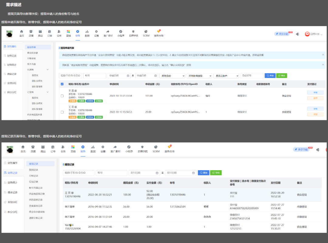 后臺操作描述:提現記錄導出-新增字段:手機號
