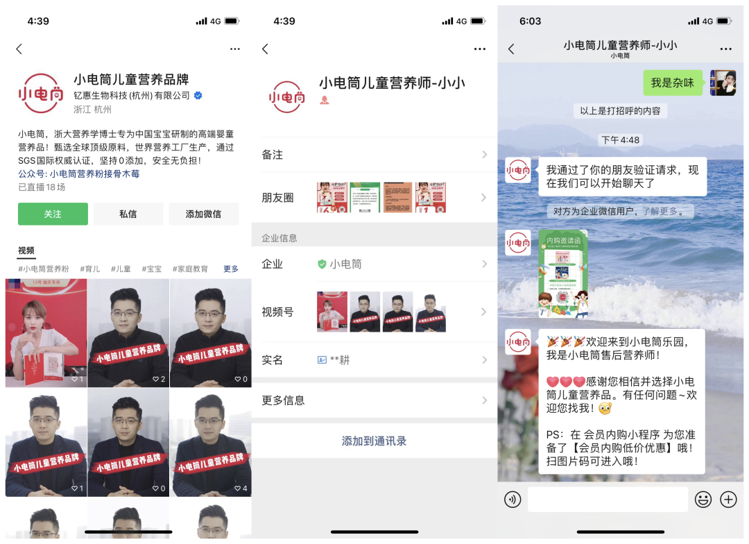 點擊視頻號的添加微信,會添加到一個叫小電筒兒童營養師-小小企微人設;