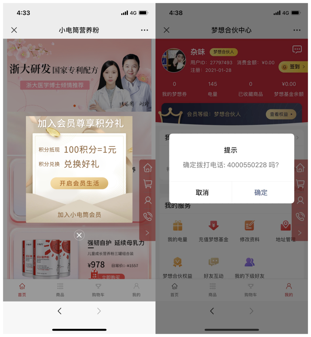 官方小程序是小電筒兒童營養粉;其中“小電筒兒童營養粉”商城小程序在首頁為其引流,用彈窗提醒大家加入小電筒會員;