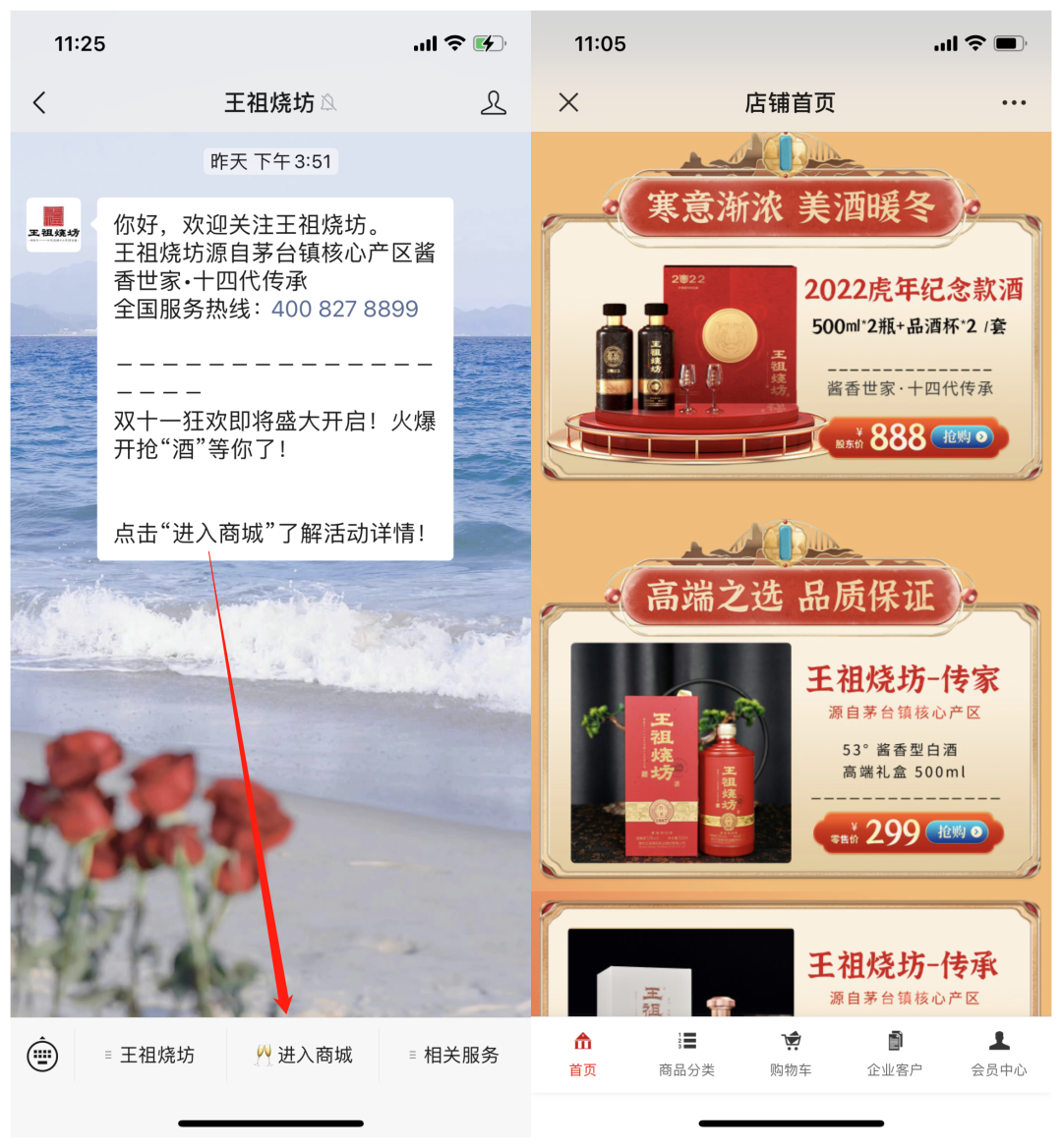 關(guān)注「王祖燒坊」公眾號(hào)后,在自動(dòng)歡迎語(yǔ)中引導(dǎo)用戶點(diǎn)擊菜單欄“進(jìn)入商城”直接下單。