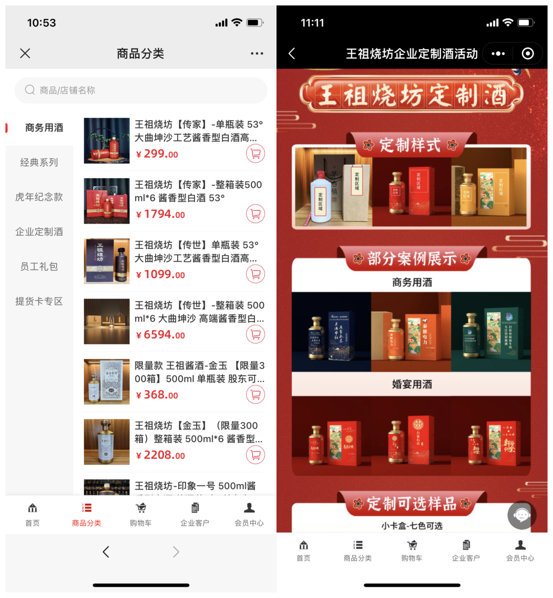 王祖燒坊通過(guò)線上商城實(shí)現(xiàn)與新消費(fèi)人群和場(chǎng)景的打通,在商品分類中,品牌通過(guò)設(shè)置商務(wù)用酒、經(jīng)典系列、虎年紀(jì)念款、企業(yè)定制酒、員工禮包、提貨卡專區(qū)分類,貼心地幫助用戶快速選擇適合的酒品,持續(xù)挖掘用戶消費(fèi)意愿。