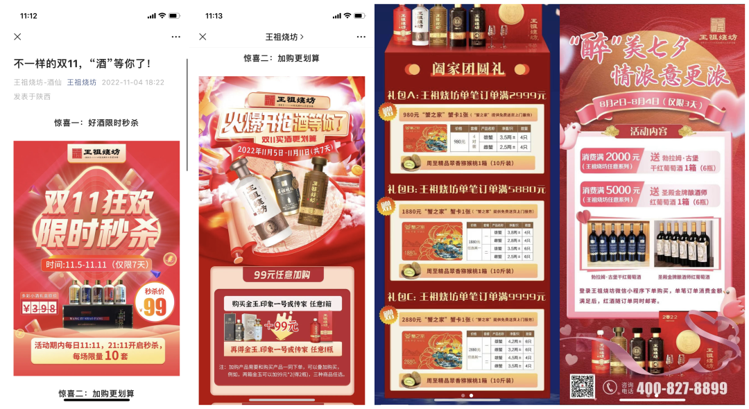 王祖燒坊適逢傳統(tǒng)節(jié)日、大促營(yíng)銷節(jié),商城內(nèi)會(huì)上線特惠福利給到消費(fèi)者,如“滿贈(zèng)”、“秒殺”等營(yíng)銷活動(dòng)。