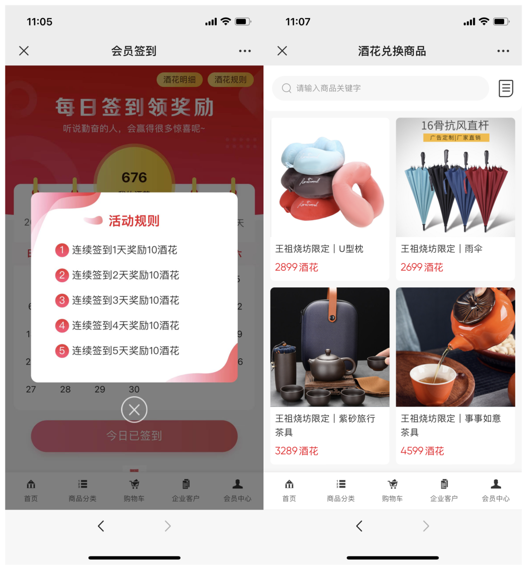 在白酒商品之外,王祖燒坊把低客單、復(fù)購(gòu)高的生活用品:如U型枕、雨傘等引入到線上商城,再通過(guò)上線簽到打卡、蘿卜精靈游戲、下單贈(zèng)酒花(積分)等營(yíng)銷玩法,提升客戶的進(jìn)店頻次,同時(shí)酒花(積分)還能兌換該類商品。