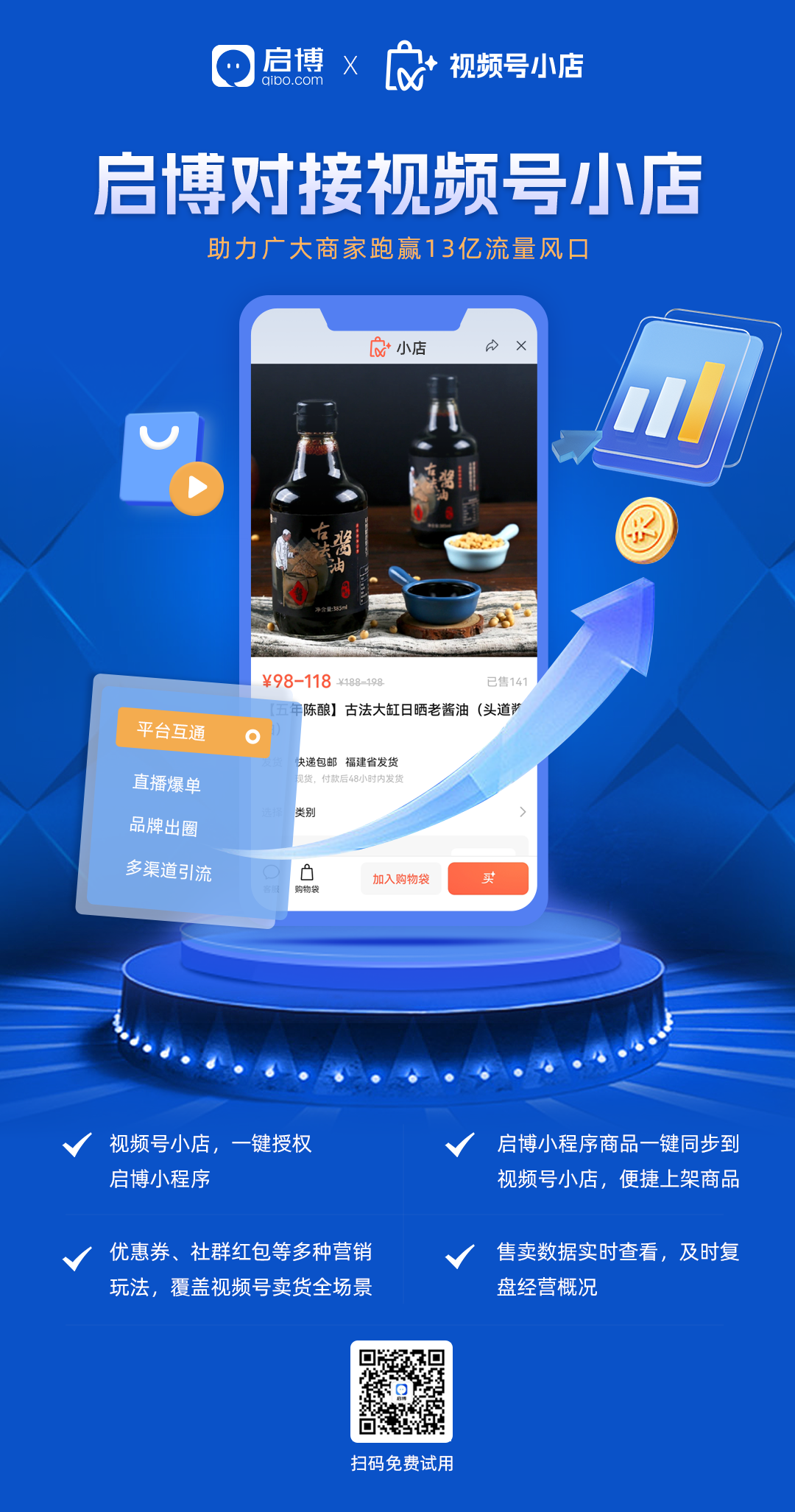 商家可通過小店綁定啟博微分銷/啟小鋪,實現小程序店鋪商品馬上推送至視頻號直播間、視頻號小店和小程序商城的一盤貨經營、統一商品。