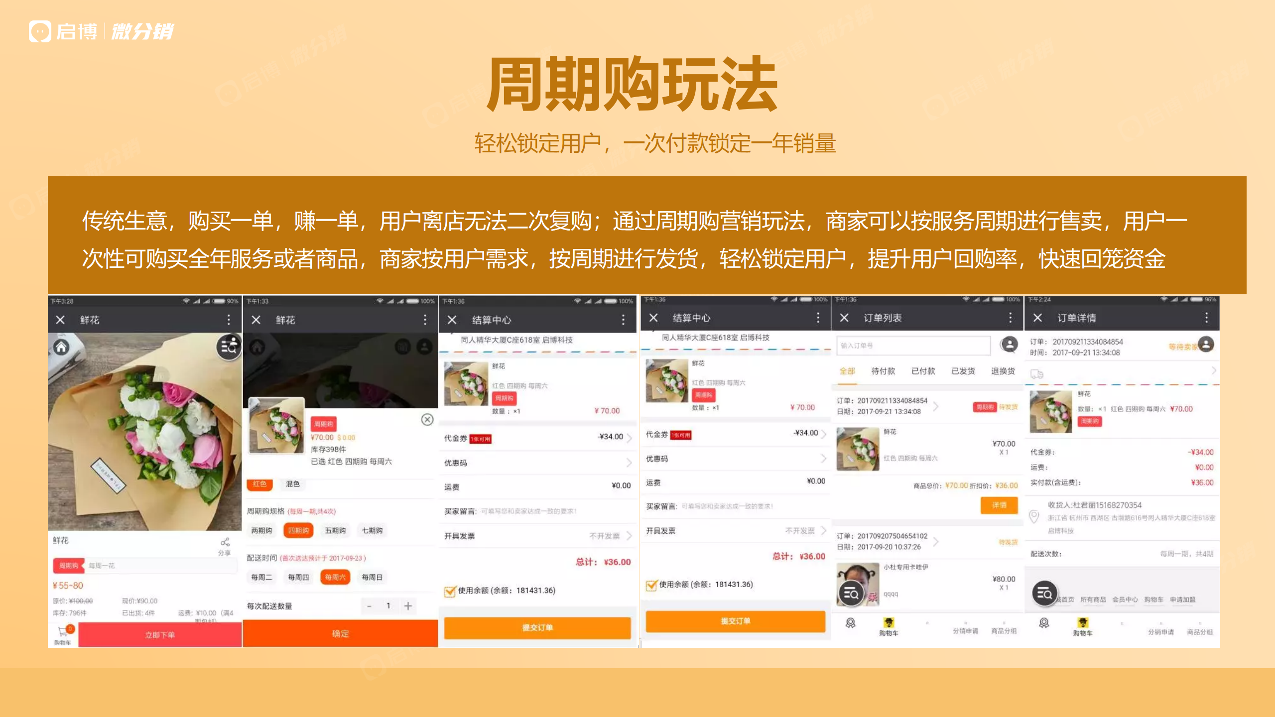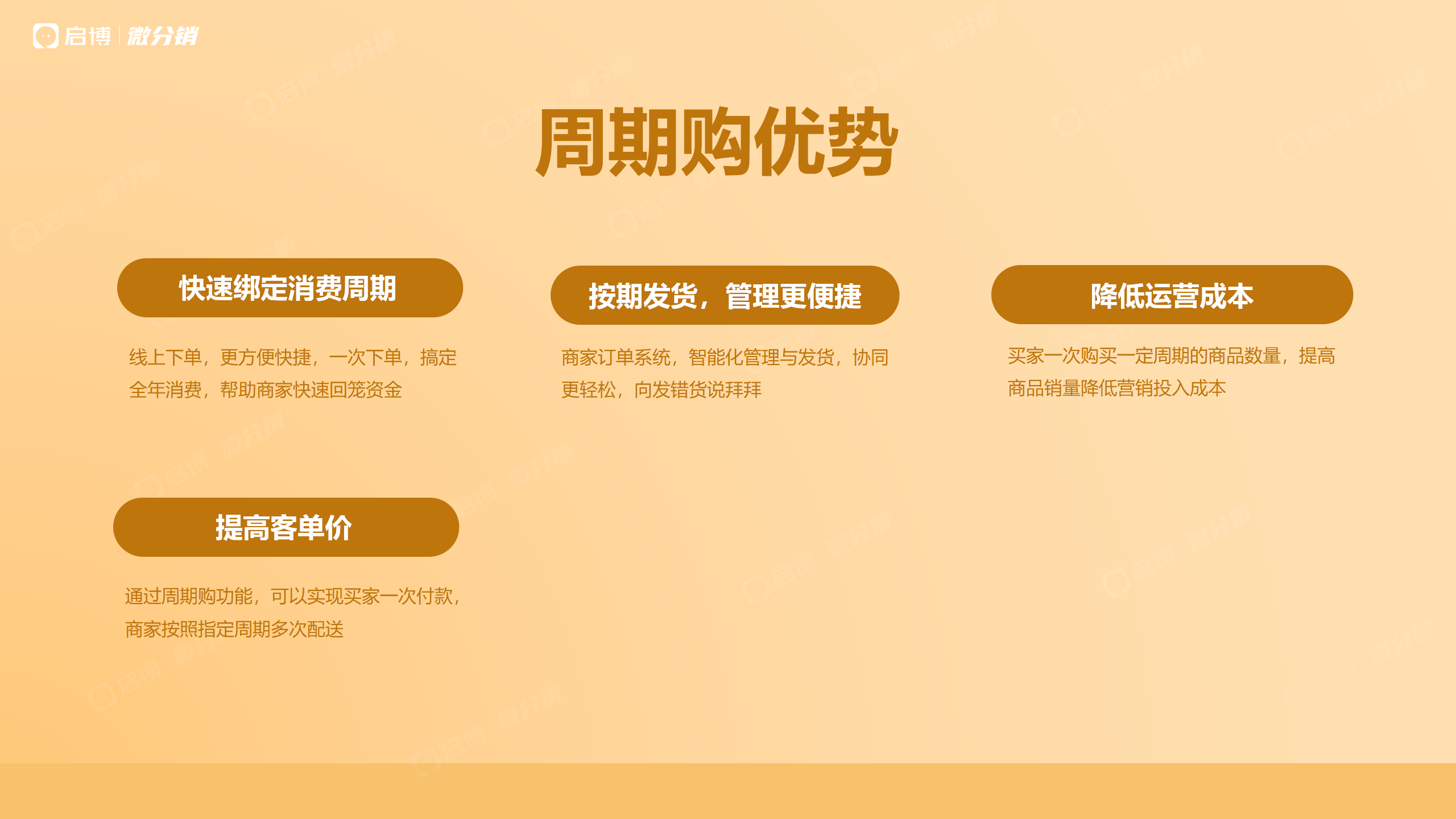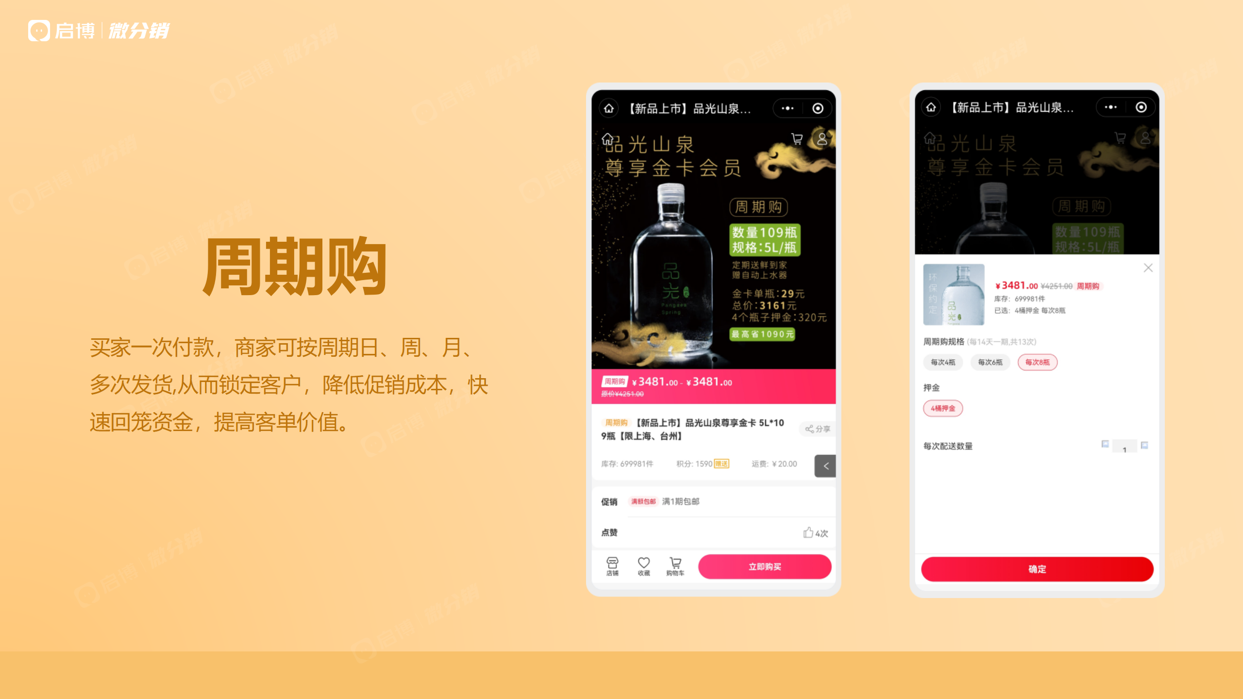 啟博微分銷“周期購”功能助力商家打造“線上運營+配送到家+周期購”模式,實現“買家一次性付款,商家多次發貨”的消費場景,對于買家而言,則無需重復下單,還能享受更優惠的價格;對于賣家而言,可以實時盤活庫存,減輕資金壓力。