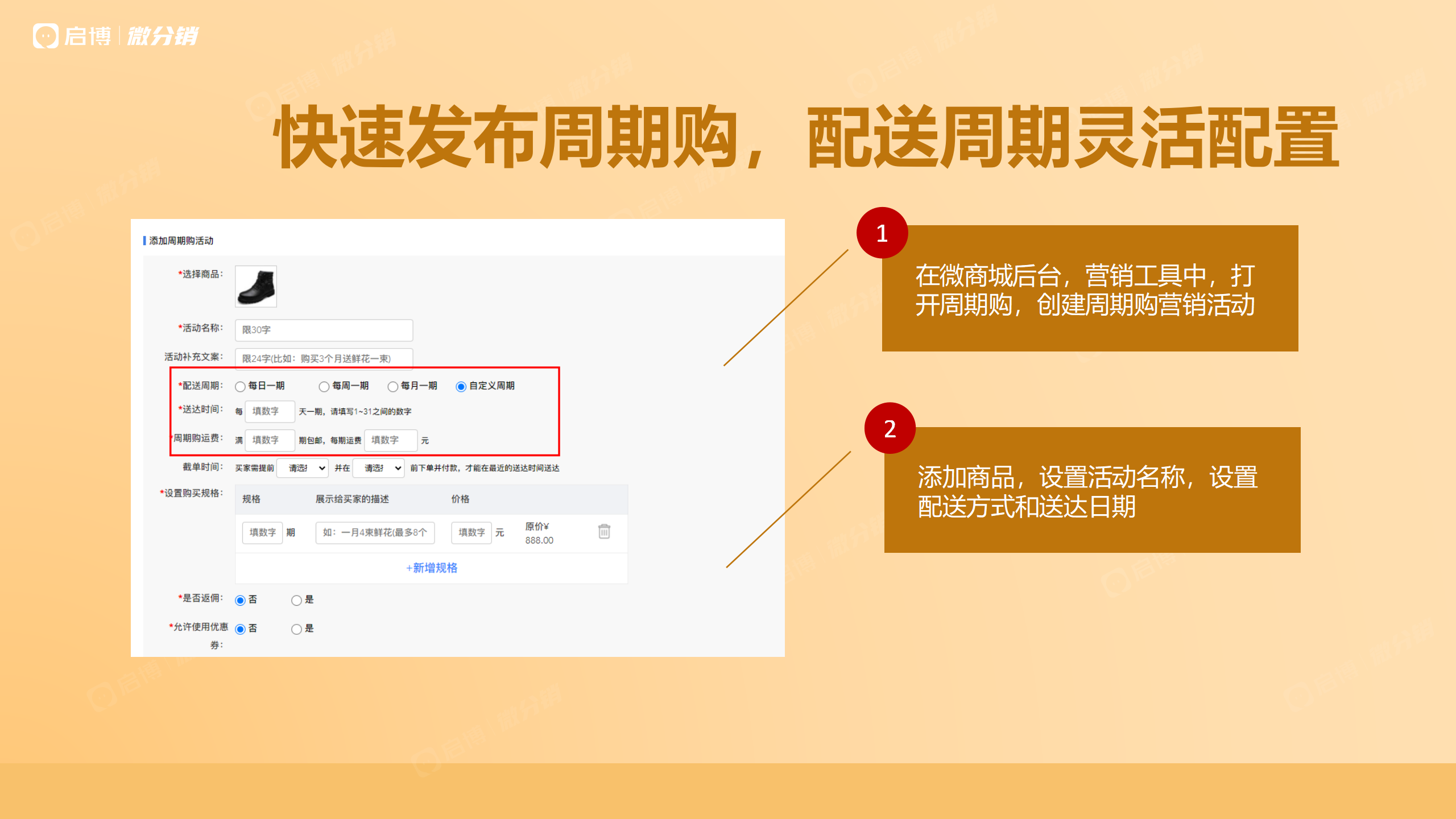 商家可借助啟博微分銷“周期購”營銷功能,根據商品、用戶群體自定義設置活動名稱、配送方式和送達日期。
