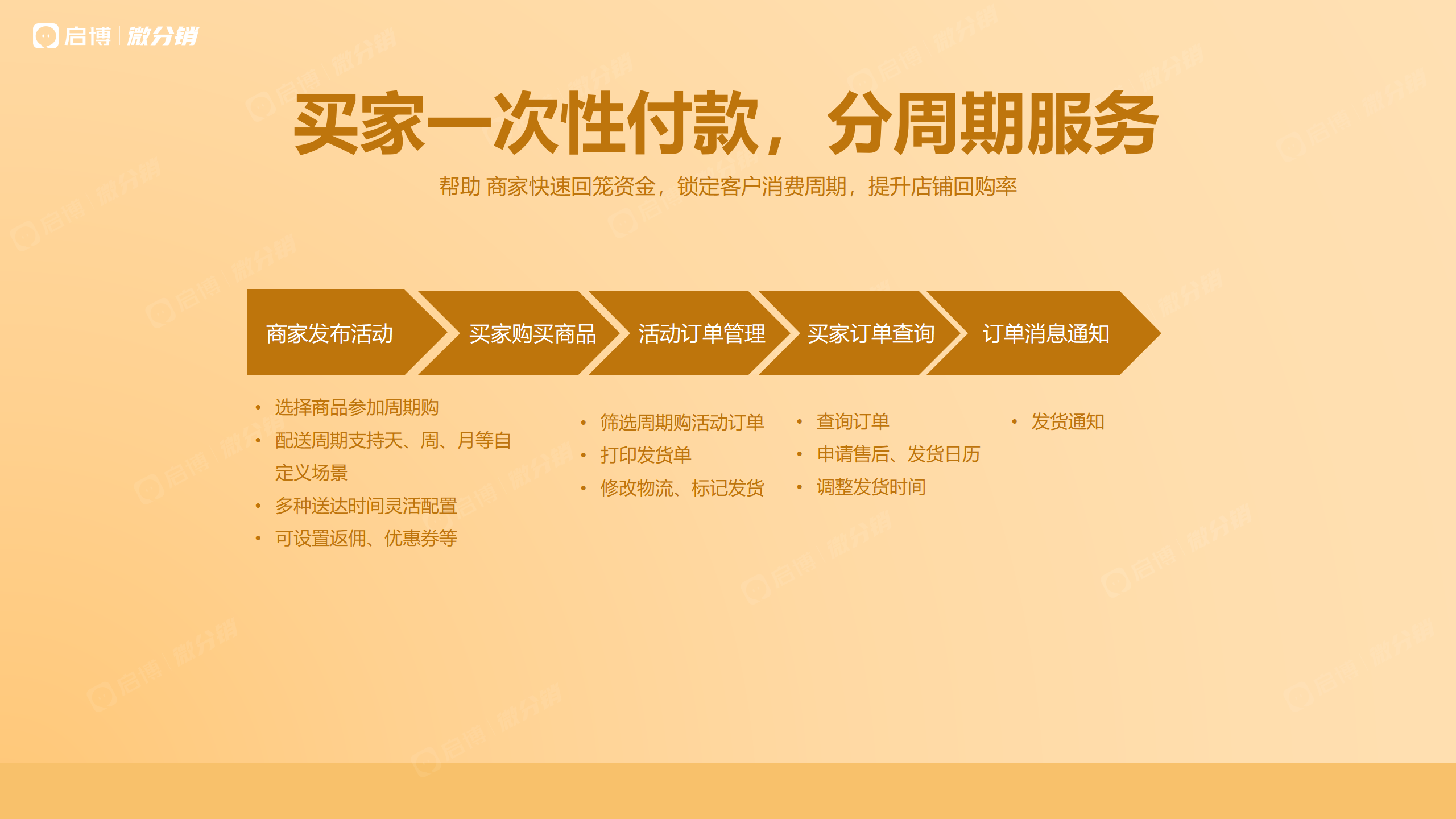 為了幫助商家解決這樣的經營困境,啟博微分銷“周期購”功能助力商家打造“線上運營+配送到家+周期購”模式,實現“買家一次性付款,商家多次發貨”的消費場景,對于買家而言,則無需重復下單,還能享受更優惠的價格;對于賣家而言,可以實時盤活庫存,減輕資金壓力。