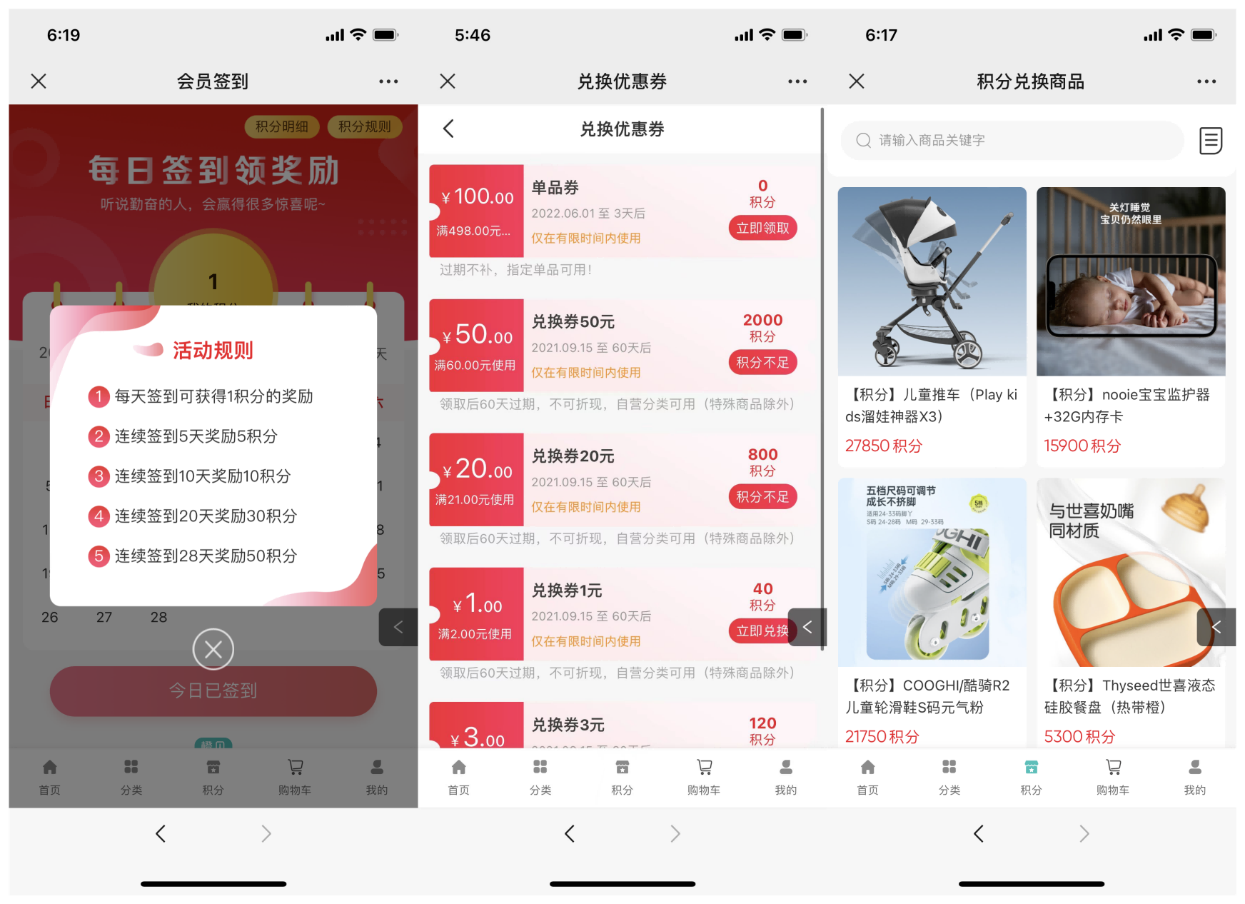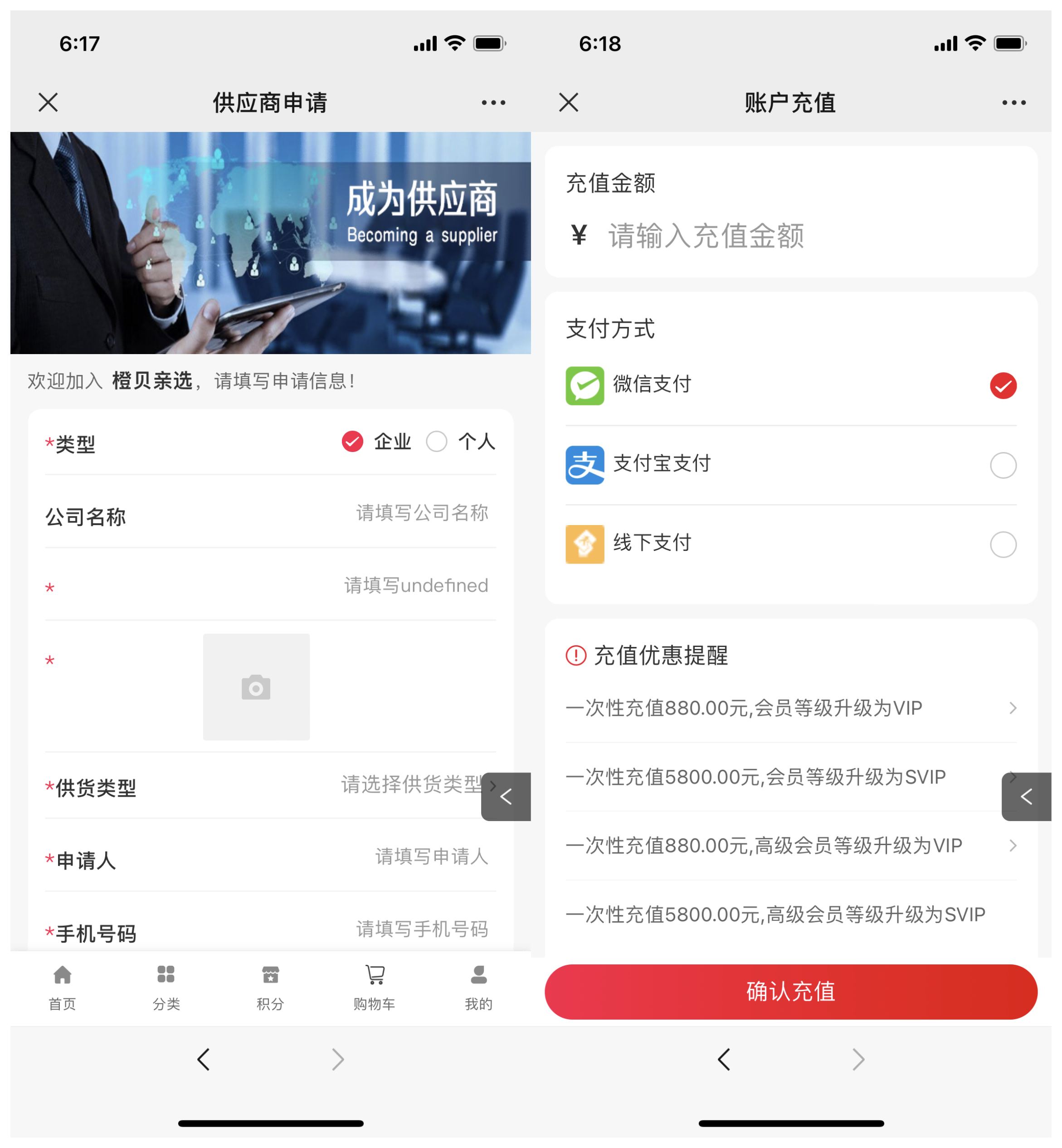 橙貝親選合作啟博微分銷系統,搭建了微商城小程序商城,一店雙核商城分布由“首頁”、“分類”、“積分”、“購物車”、“我的”五大模塊構成。