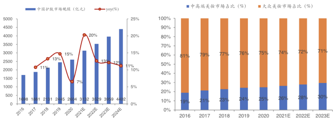 我國美妝護膚市場處于快速增長階段。根據歐睿數據,2020年市場規模達2604億元,預計2024年將達到4402億元,2021-2024年復合增速12%。