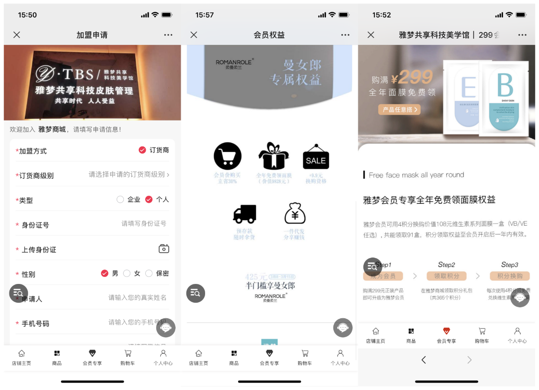 在柔曼柔蘭微商城內,除了看到他們做了私域直播的動作外,柔曼柔蘭的數字化轉型已經有了一定規模,目前能做到全業務的覆蓋,包括商品、加盟商、會員、門店、訂單、活動、庫存和傭金等八大業務。