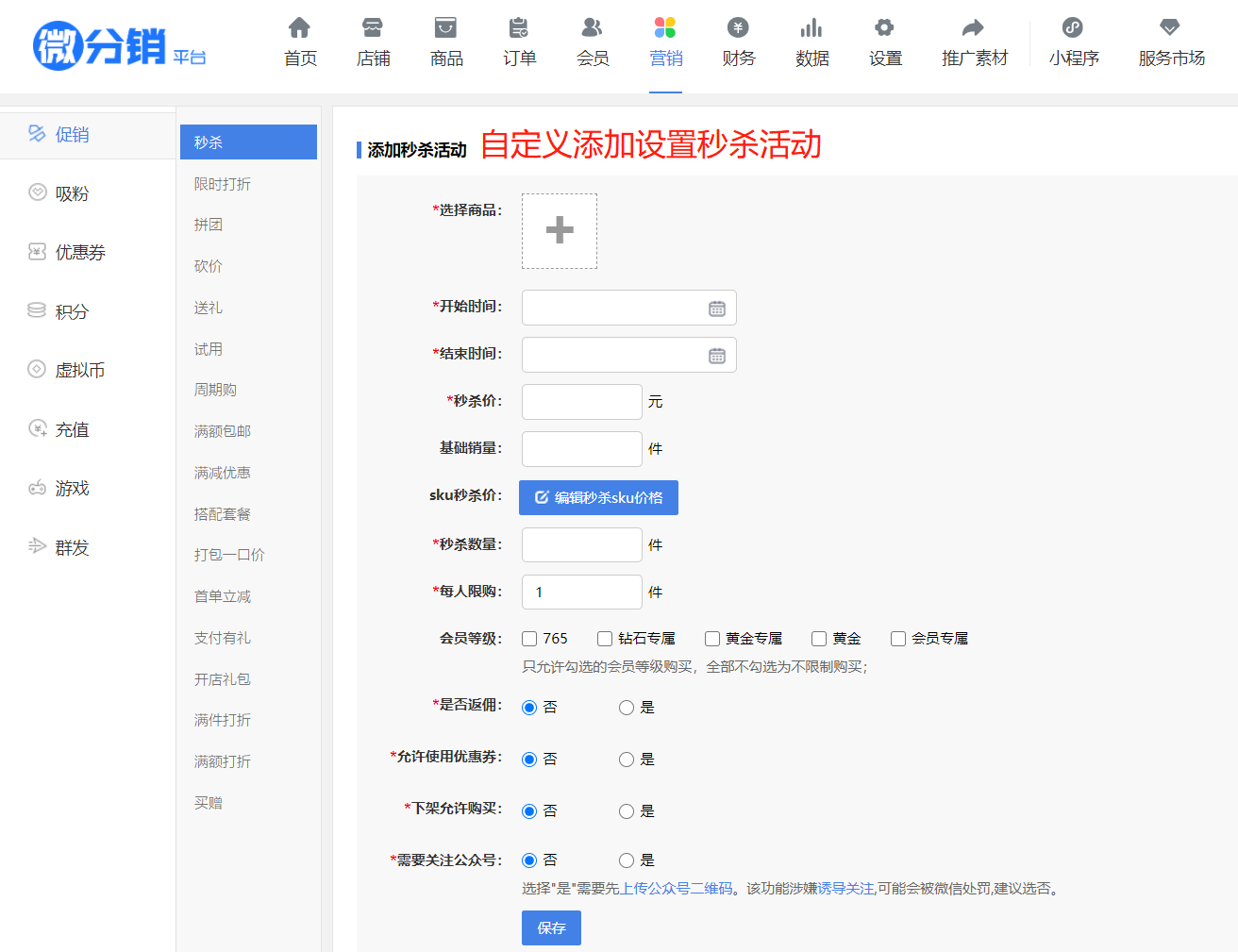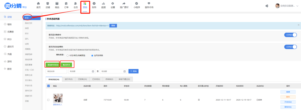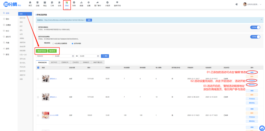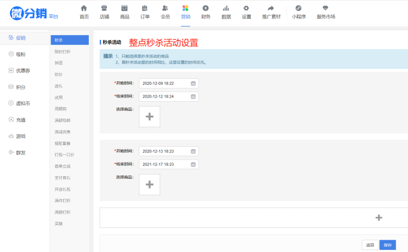 1、如何在啟博微分銷商家管理后臺(tái)創(chuàng)建一場(chǎng)“限時(shí)秒殺”活動(dòng):