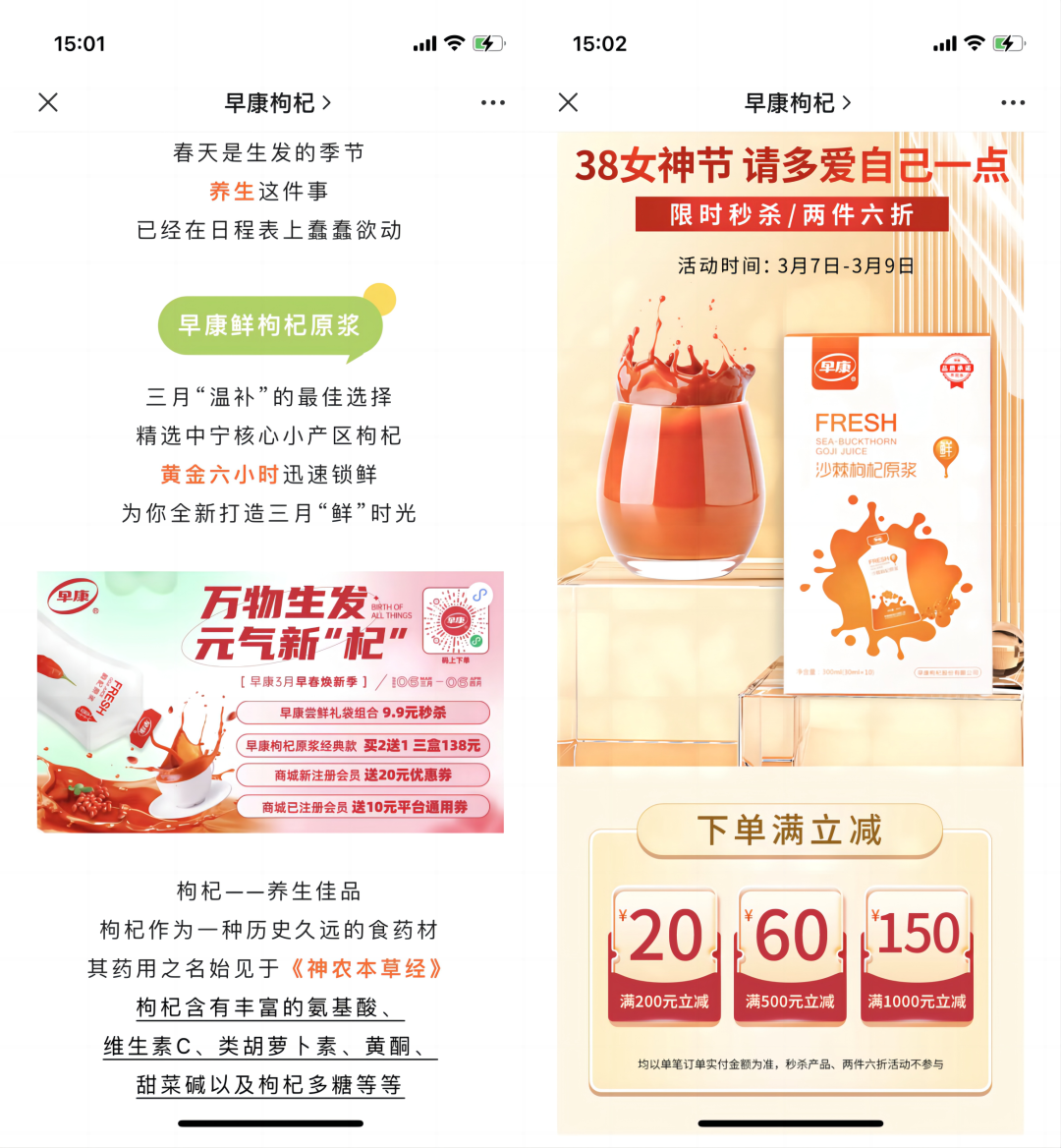 早康枸杞上線“3月早春煥新季”活動,活動時間在3月6日-4月6日,同時借著38女神節日上線女神節“限時秒殺+限時打折+滿減”活動,根據百度指數,早康的核心消費群體年齡層大致集中在20-29歲以及30-39歲的男性。