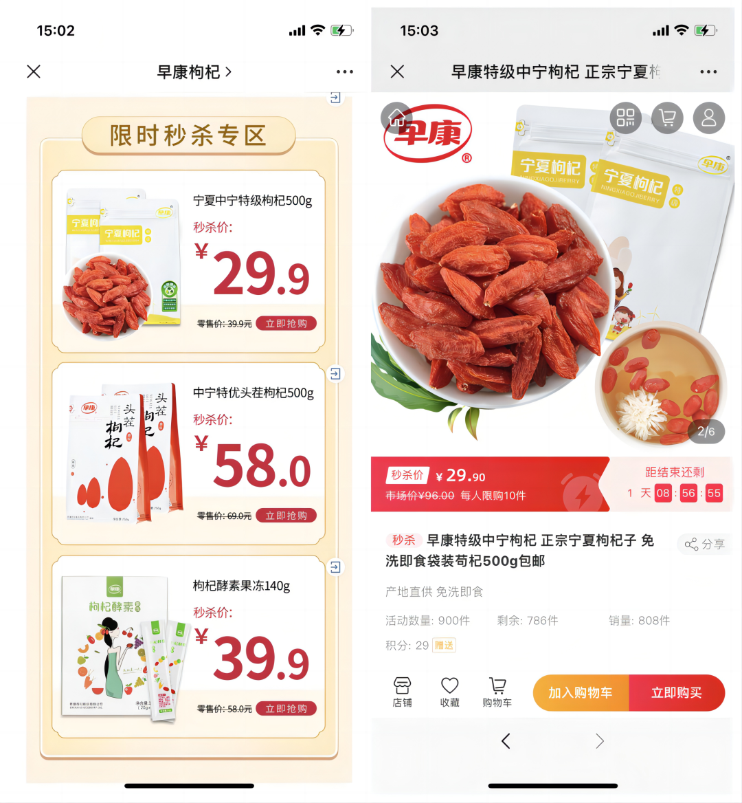 早康公司成立于1999年,是國內最大的優質枸杞系列產品供應商之一,早康枸杞從功效、用途、客戶需求等多方面出發,研究出了以枸杞為原材料的多個品類,比如蜂蜜、紅糖、酵素,通過不斷提升評判標準,配合小規模生產、推廣,以此保證產品的受歡迎程度,最終提高用戶的復購率,激發潛在用戶的購買欲。