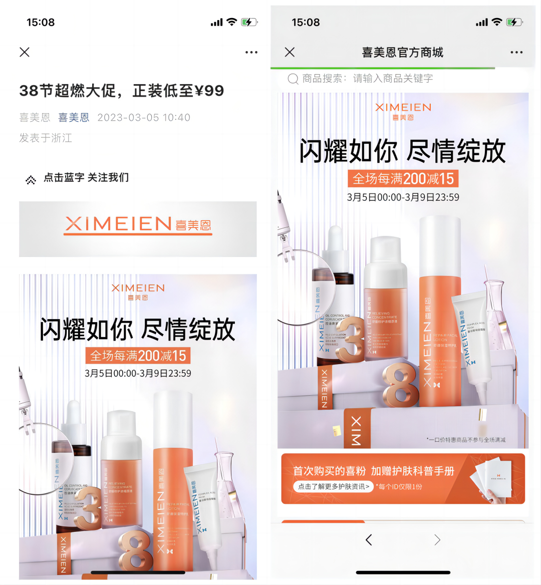 喜美恩逢38女神節上大促營銷活動,商城內會上線特惠福利給到消費者,如“滿減”、“買贈”等營銷活動。