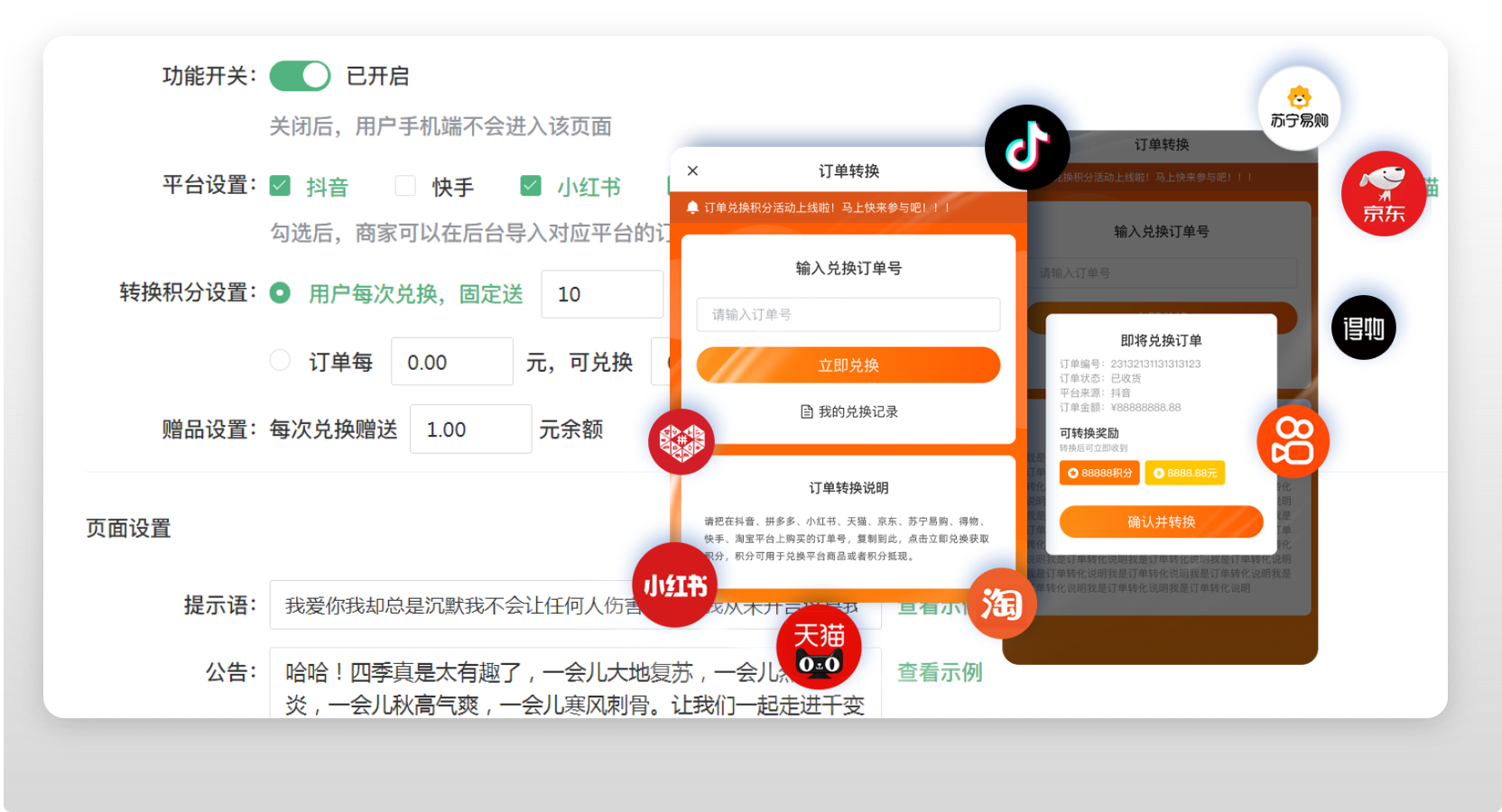 通過公域訂單兌換私域積分好禮的方式,將粉絲高效引導至私域,沉淀到私域的粉絲。消費者復制抖音訂單號,進入小程序輸入抖音訂單號,兌換積分/優惠券/儲值現金等。