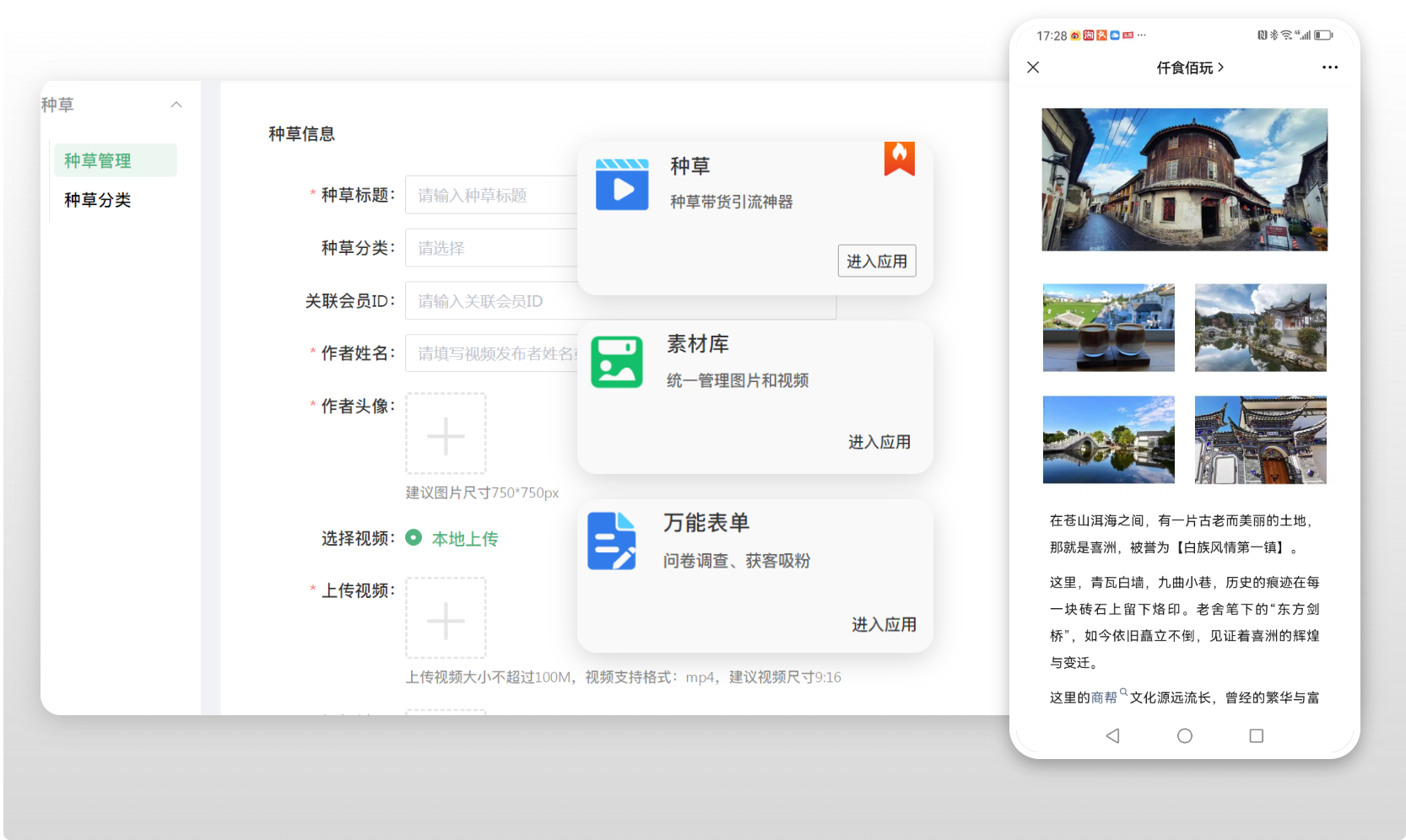 商家可以通過小程序?qū)崿F(xiàn)多樣化的內(nèi)容展現(xiàn),例如:圖文介紹、視頻介紹、直播介紹、短視頻種草等,以及通過公眾號、小程序、朋友圈、微信群等多種渠道進行裂變推廣。